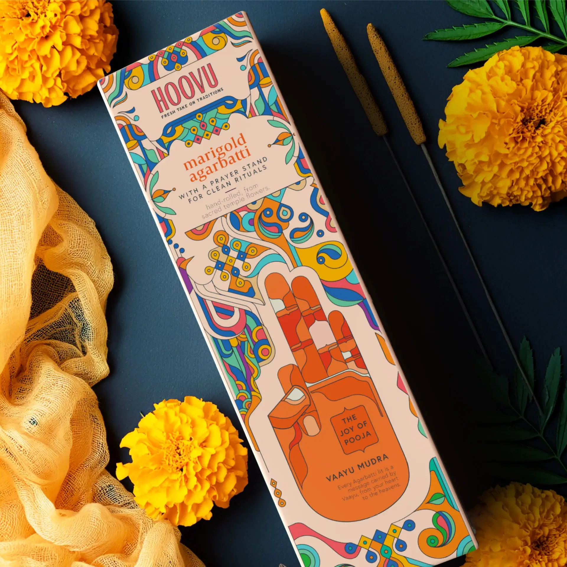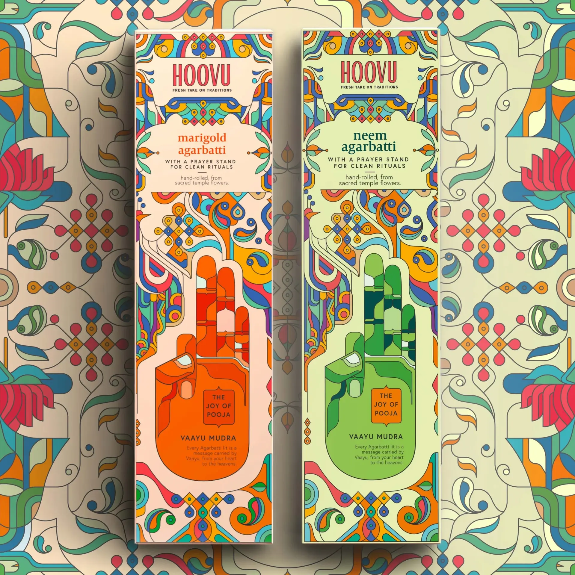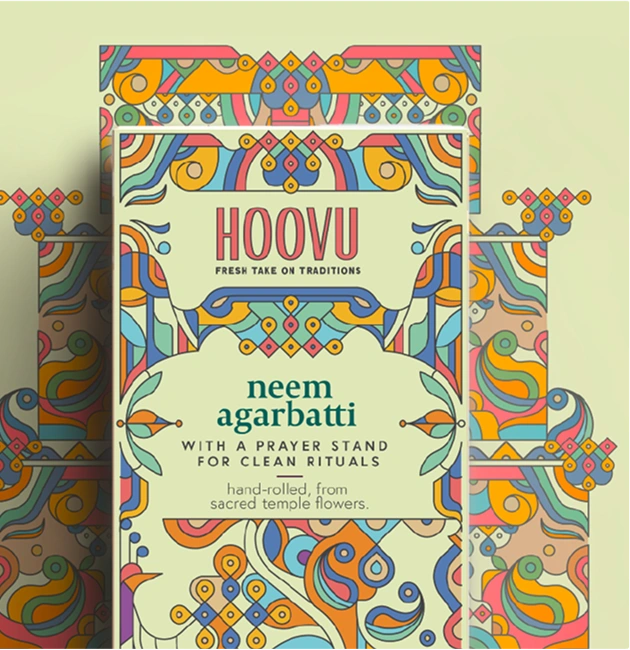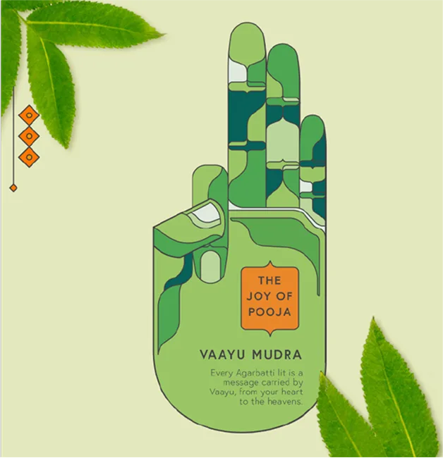 Our consumer immersions revealed the apprehensions and aspirations people carry into their rituals, and how everyday choices are elevated into divine offerings. This insight led us to the ancient wisdom of the Panchbootas (the five elements — earth, water, fire, air and space), which flow through all creation and are an integral part of the daily Hindu puja. We interpreted them through the sacred Mudras, said to help channel our energy and form a deeper connection with the divine. Illustrated elements inspired by temple structures encase our Mudras, signifying the gateways to spiritual elevation and inner peace.