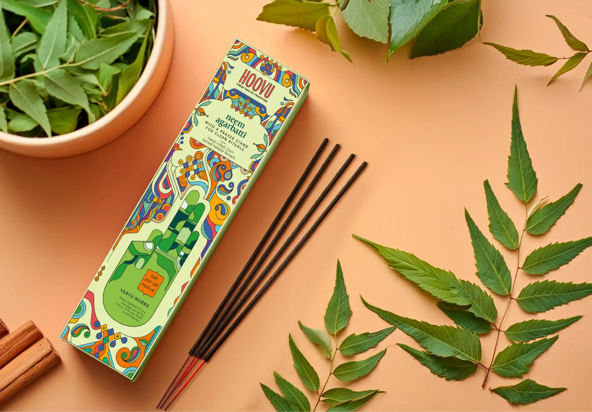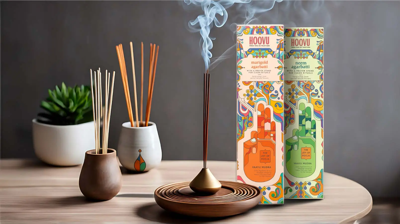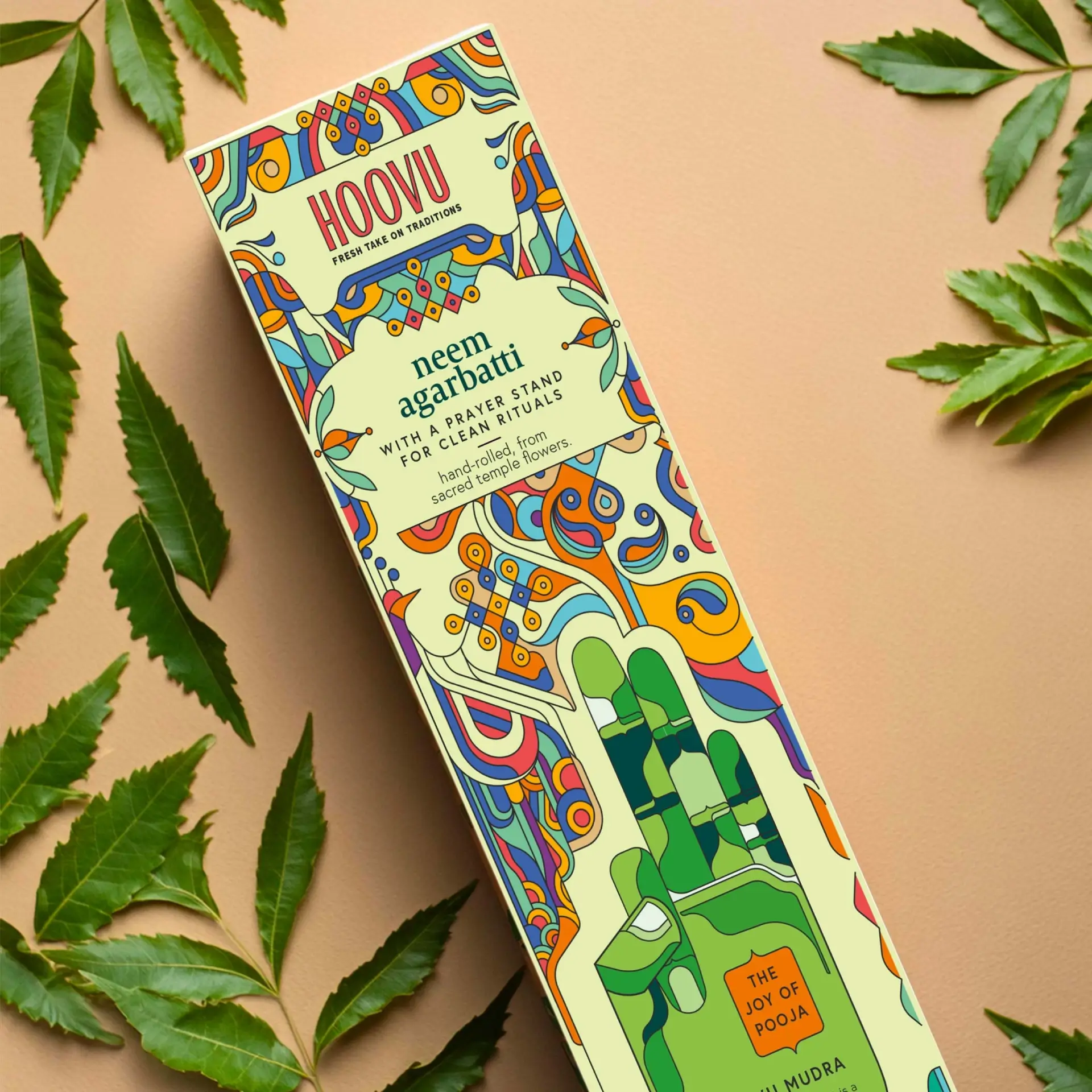 Our consumer immersions revealed the apprehensions and aspirations people carry into their rituals, and how everyday choices are elevated into divine offerings. This insight led us to the ancient wisdom of the Panchbootas (the five elements — earth, water, fire, air and space), which flow through all creation and are an integral part of the daily Hindu puja. We interpreted them through the sacred Mudras, said to help channel our energy and form a deeper connection with the divine. Illustrated elements inspired by temple structures encase our Mudras, signifying the gateways to spiritual elevation and inner peace.